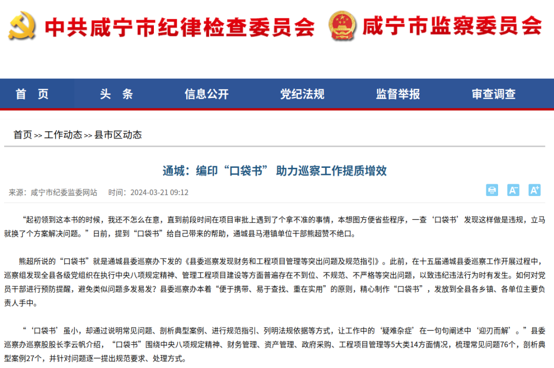 (3月20日)市纪委监委网站 |通城:编印“口袋书” 助力巡察工作提质增效