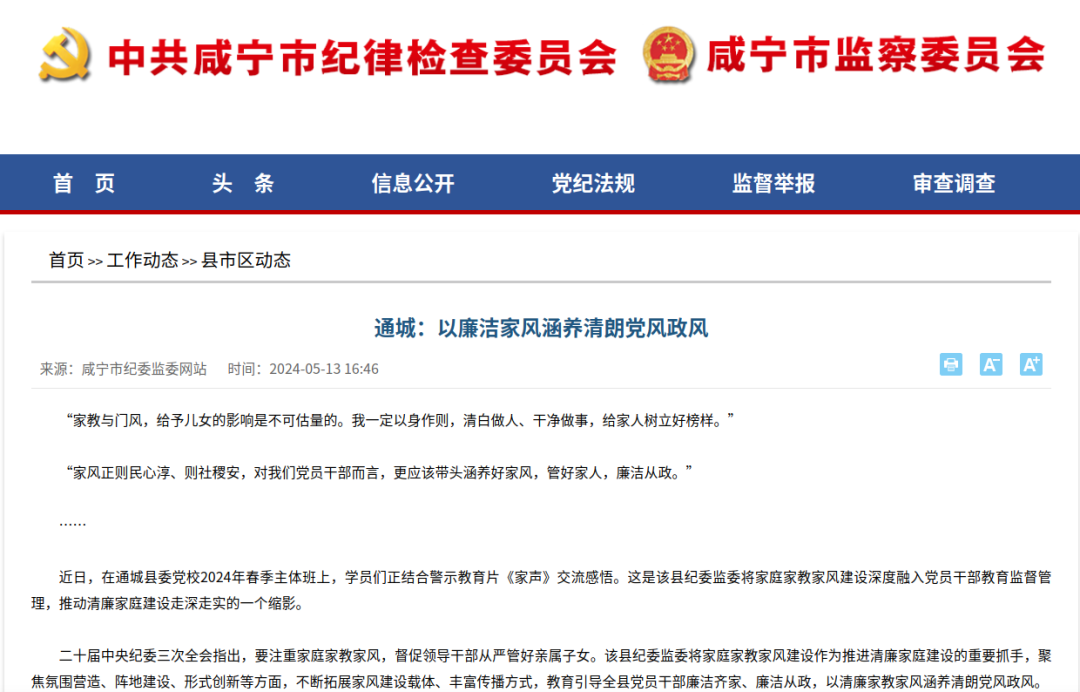 (5月13日)市纪委监委网站|通城:以廉洁家风涵养清朗党风政风