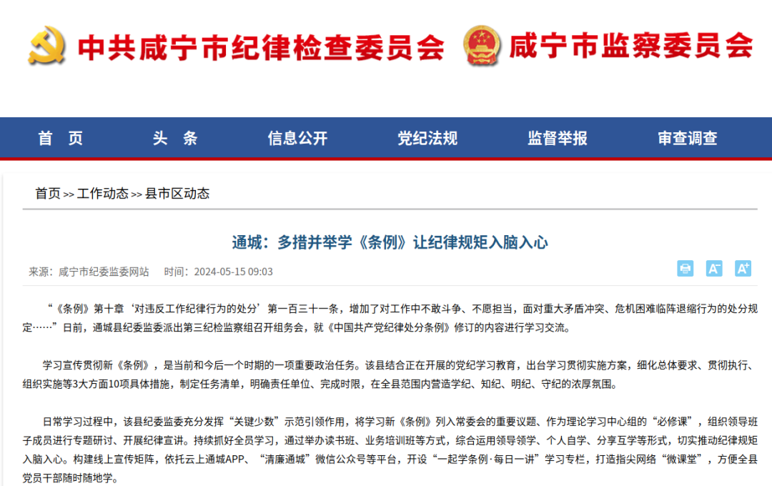 (5月15日)市纪委监委网站|通城:多措并举学《条例》让纪律规矩入脑入心