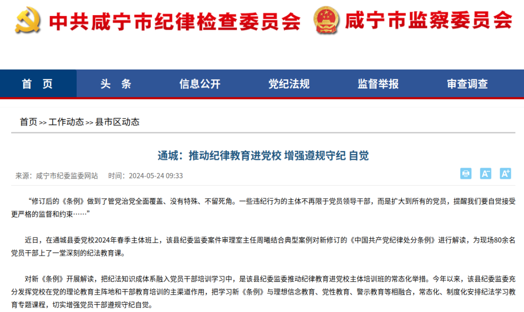 (5月24日)市纪委监委网站|通城:推动纪律教育进党校 增强遵规守纪自觉