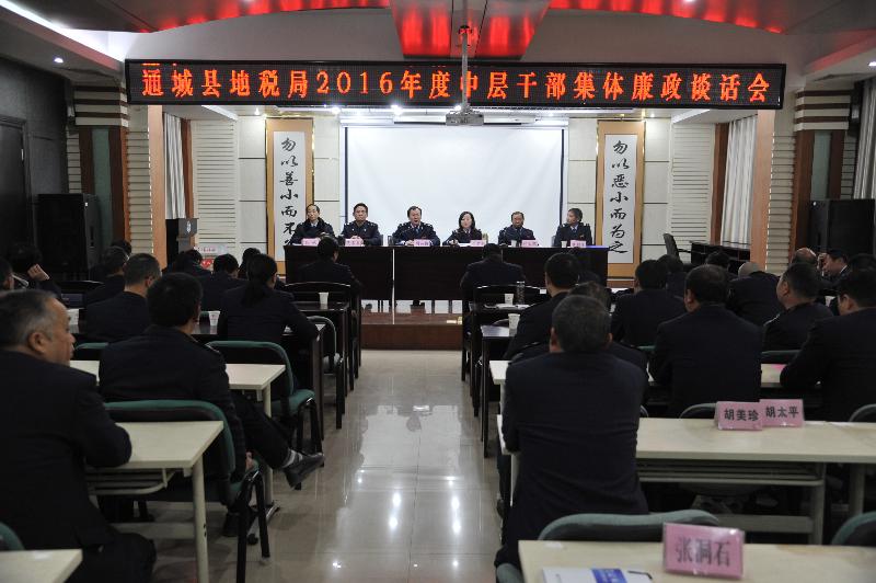 3月15日下午,县地税局组织召开2016年中层干部集体廉政谈话会,各科室正副科长、各分局班子成员及各管理组组长集体接受了廉政谈话。
