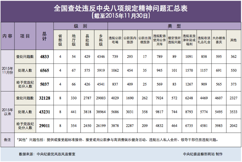 为掌握全国贯彻落实中央八项规定精神情况,中央纪委在31个省区市和新疆生产建设兵团、66个中央和国家机关、111个中央企业、15个中央金融企业建立了落实中央八项规定精神情况月报制度。2015年以来,截至11月30日,全国查处违反中央八项规定精神问题情况如下: