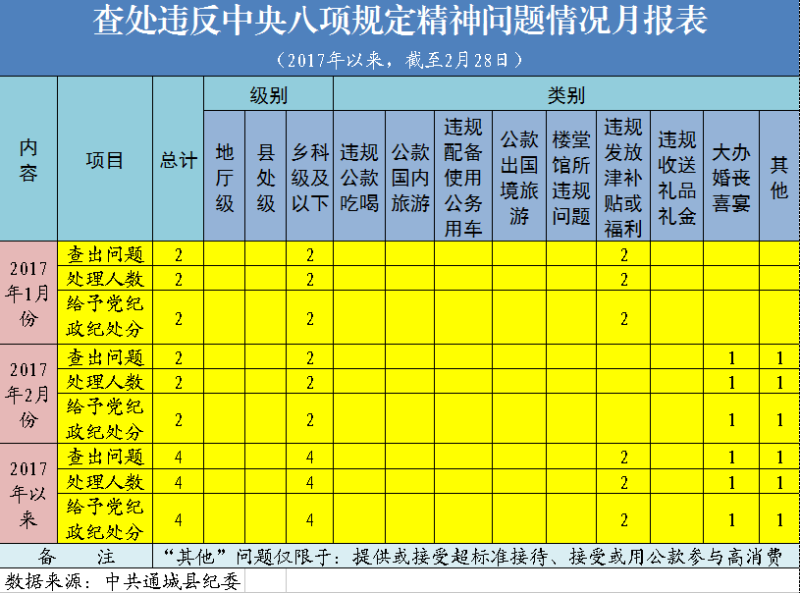 2017年2月全县累计查处违反中央八项规定精神问题4起