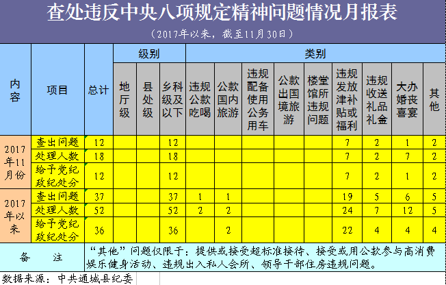 2017年以来,截至11月30日,全县查处违反中央八项规定精神问题情况如下: