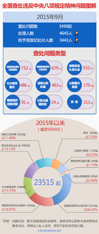 为掌握全国贯彻落实中央八项规定精神情况,中央纪委在31个省区市和新疆生产建设兵团、66个中央和国家机关、111个中央企业、15个中央金融企业建立了落实中央八项规定精神情况月报制度。2015年以来,截至9月30日,全国查处违反中央八项规定精神问题情况如下: