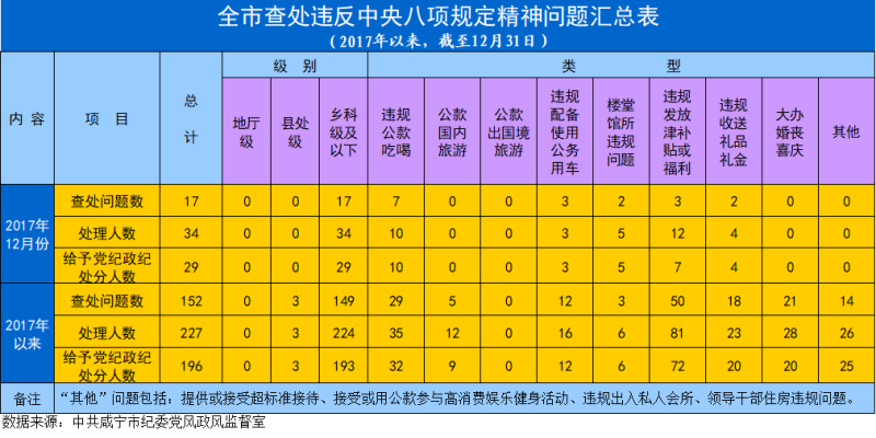 2017年以来,截至12月31日,全市查处违反中央八项规定精神问题情况如下: