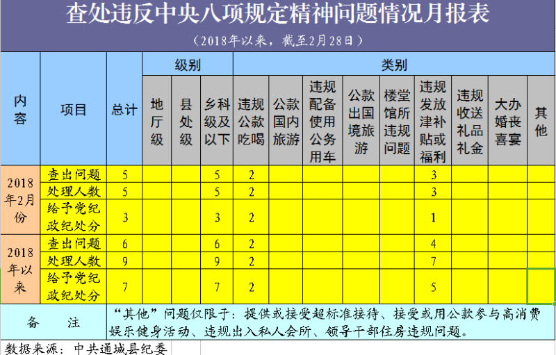 查处违反中央八项规定精神问题情况月报表