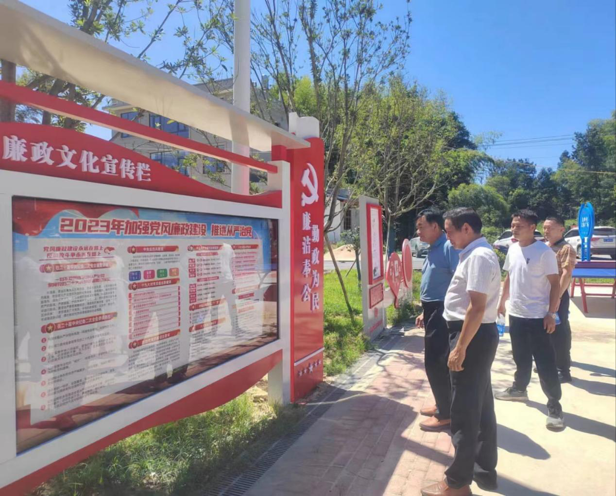 以清廉村居建设为抓手,该县纪委监委督促各乡镇深入挖掘本地红色资源、村规民约中的廉洁文化元素,加强廉洁文化宣传教育,绘就乡村振兴“清廉”画卷。图为该县纪检监察干部在马港镇查看廉政文化建设情况。(张瑞豪 高欣)
