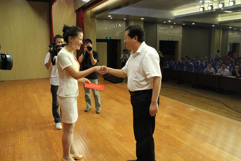 图为县委书记姜卫东为一等奖获得者张妮颁发荣誉证书